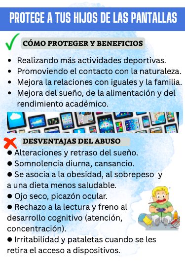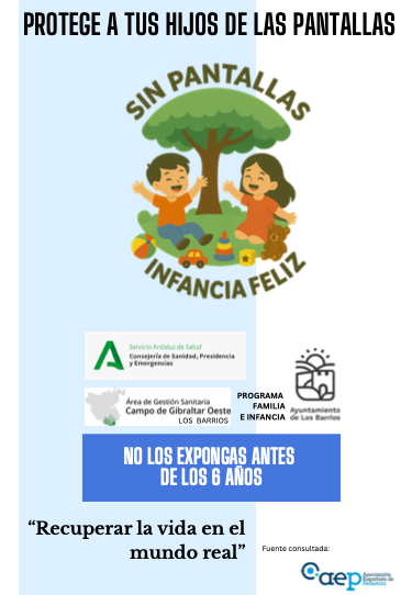 • Difundir la recomendación de la Asociación Española de Pediatría sobre el no uso de pantallas antes de los 6 años.